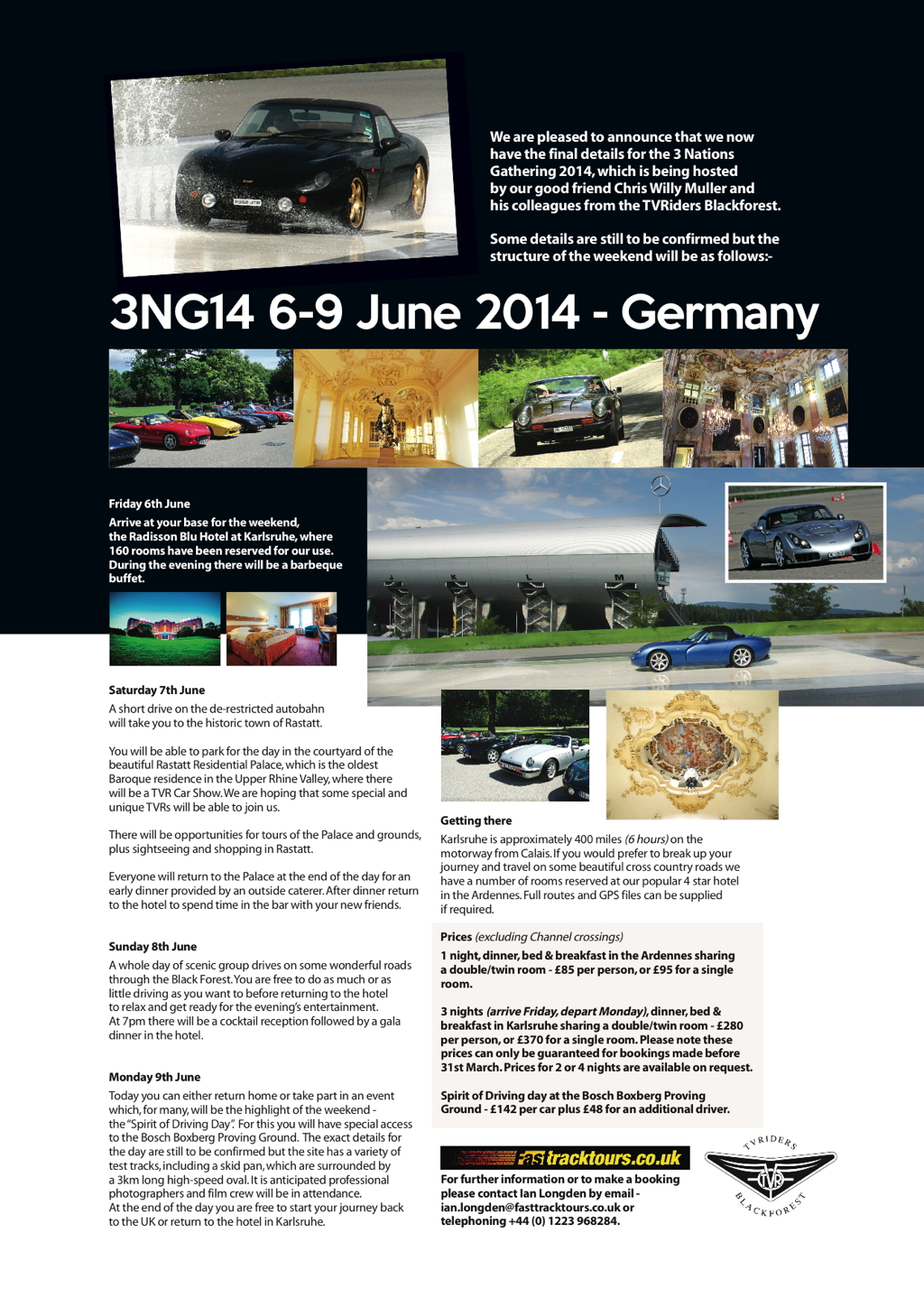 wir haben die Ehre Euch zum - 18. TVR Dreiländertreffen an Pfingsten vom 05.-09. Juni 2014 - in die Barock-& Residenzstadt Rastatt einzuladen. Die Veranstaltung wird dieses Jahr um einen weiteren (Motorsport-) Tag anlässlich des 20 jährigen Bestehens der TVRiders Blackforest ergänzt. Zum ersten Mal in der Geschichte dieses Treffens, hat der TVR Car Club UK eine offizielle Tour zum "Three Nation Gathering 2014" (3NG14) ausgeschrieben.